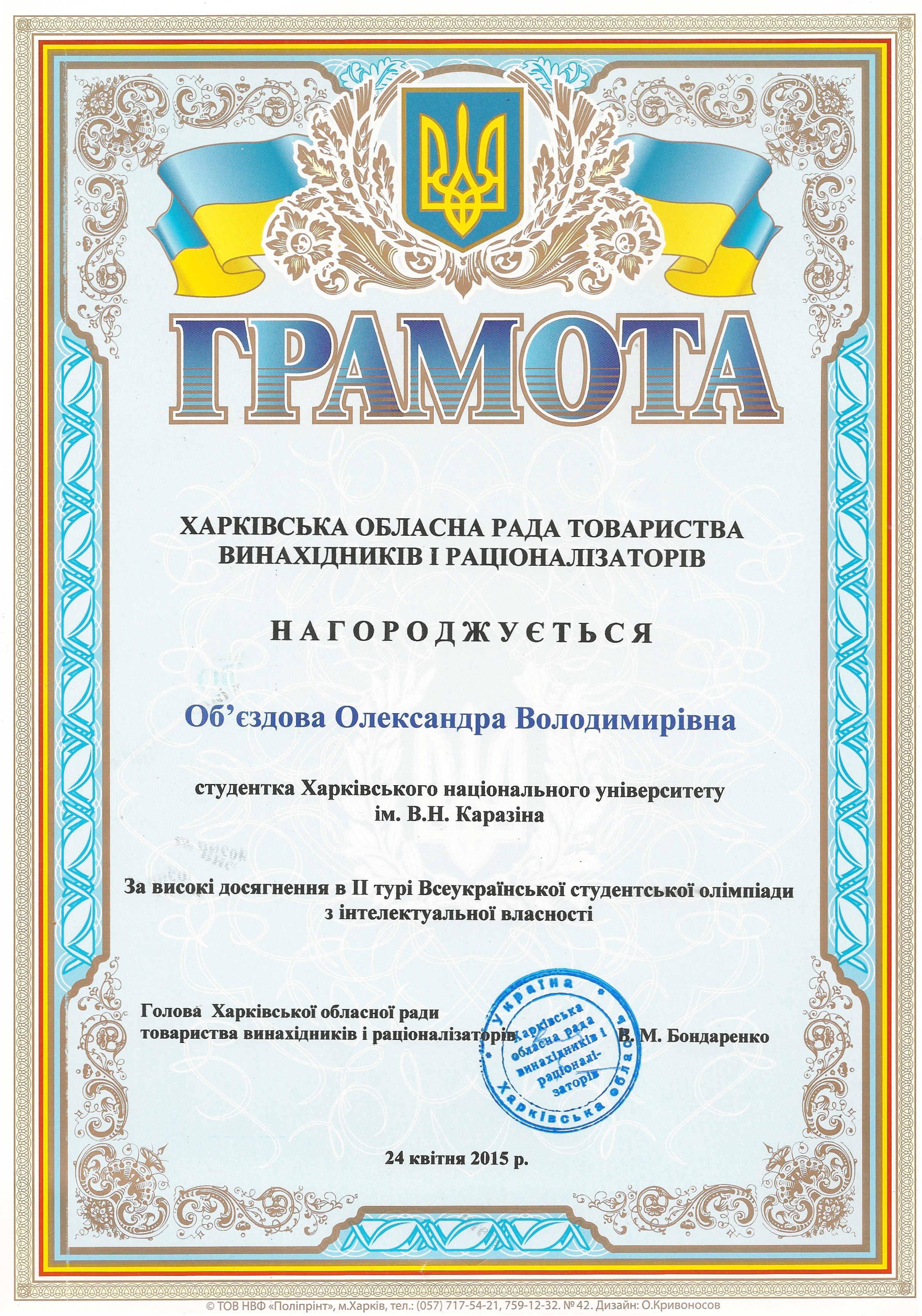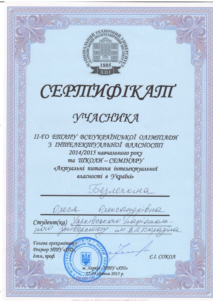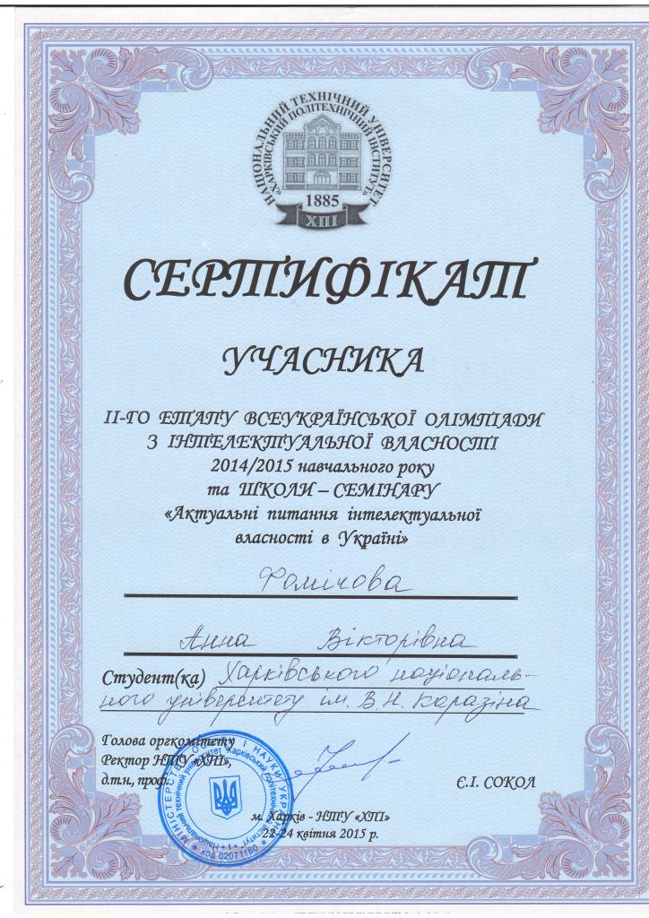 23 квітня у Національному технічному університеті «Харківський політехнічний інститут» відбулася Всеукраїнська студентська олімпіада з «ІНТЕЛЕКТУАЛЬНОЇ ВЛАСНОСТІ». Поздоровляємо учасників від нашої кафедри – студентів гр. ЕВ-51 Об`єздову О.В., гр. ЕР-41 Безлепкіну О.О., Фомічеву А.В.!