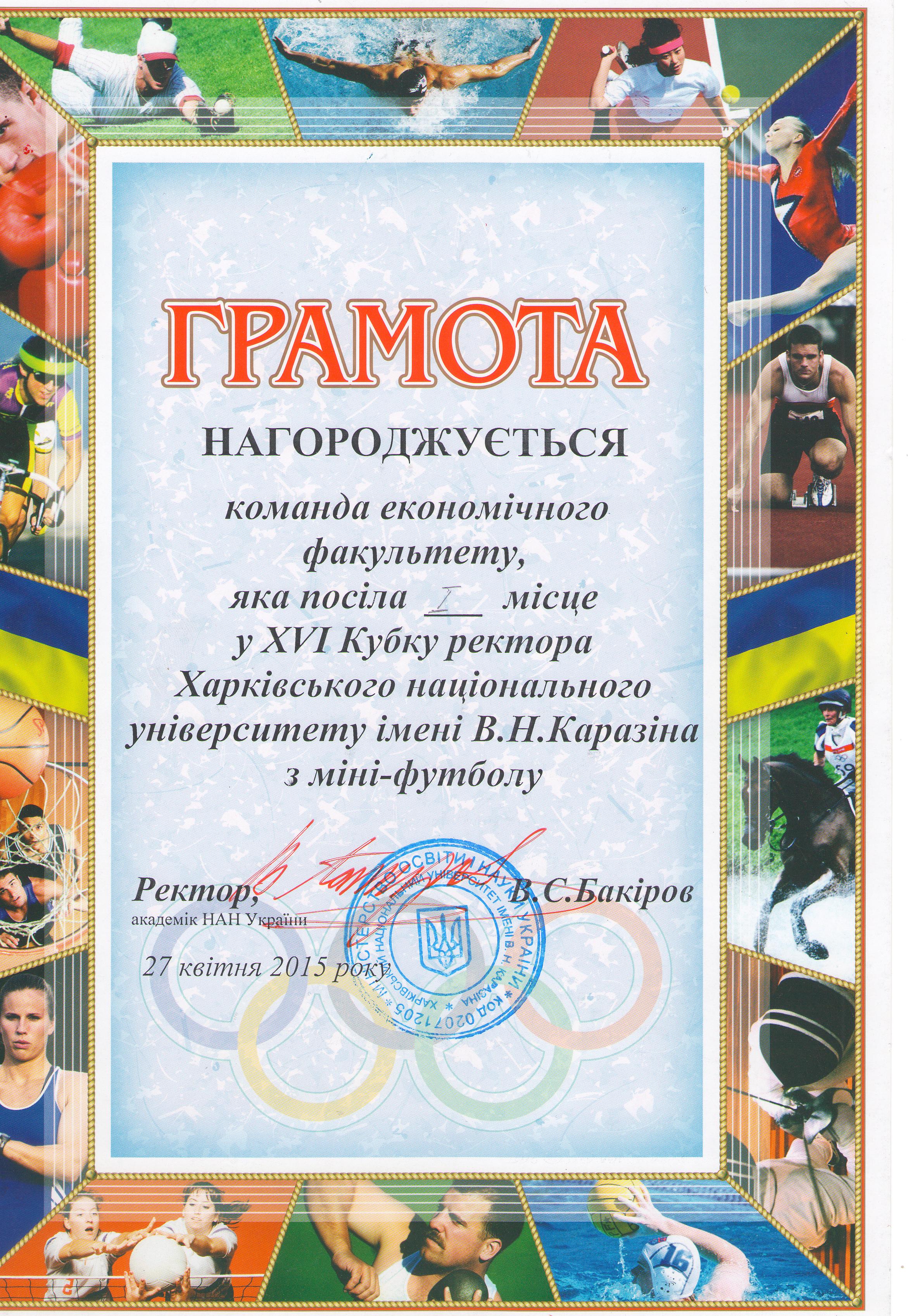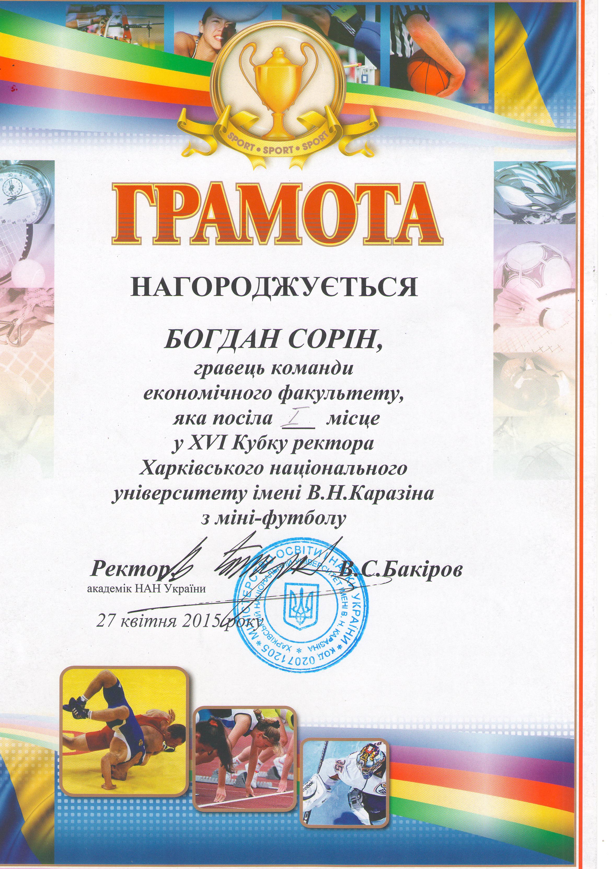 Наші студенти в 6-ий раз завоювали 1-е місце у Кубку ректора ХНУ імені В.Н. Каразіна з міні-футболу! Вітаємо команду економічного факультету і особливо студентів нашої кафедри Соріна Богдана (студента 4-го курсу спеціальності «Маркетинг») і Безуского Сергія (студента 4-го курсу спеціальності «Менеджмент ЗЕД»)!