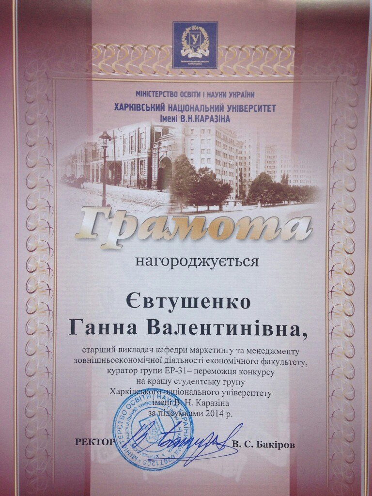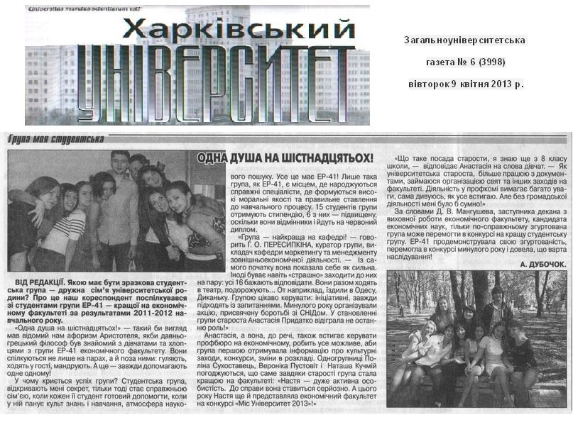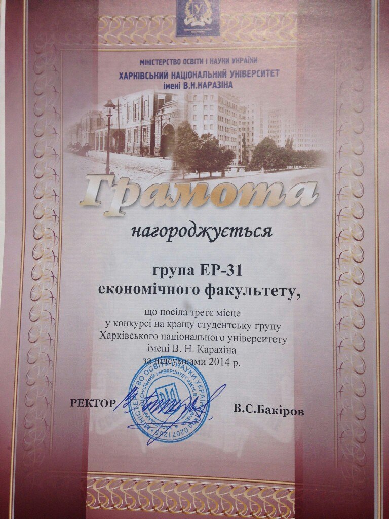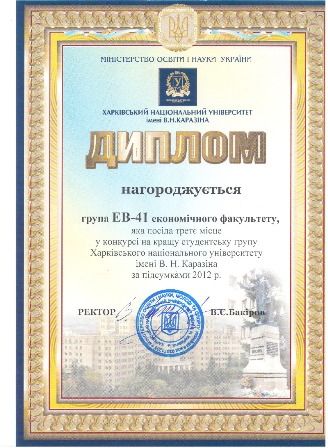 Вітаємо групу ЕВ-41 (спеціальність «Менеджмент ЗЕД»), яка посіла 3-е місце у конкурсі на кращу студентську групу Харківського національного університету імені В. Н. Каразіна за результатами 2012 року. Куратор групи – к.е.н., доцент кафедри маркетингу та менеджменту ЗЕД Мангушев Д.В.