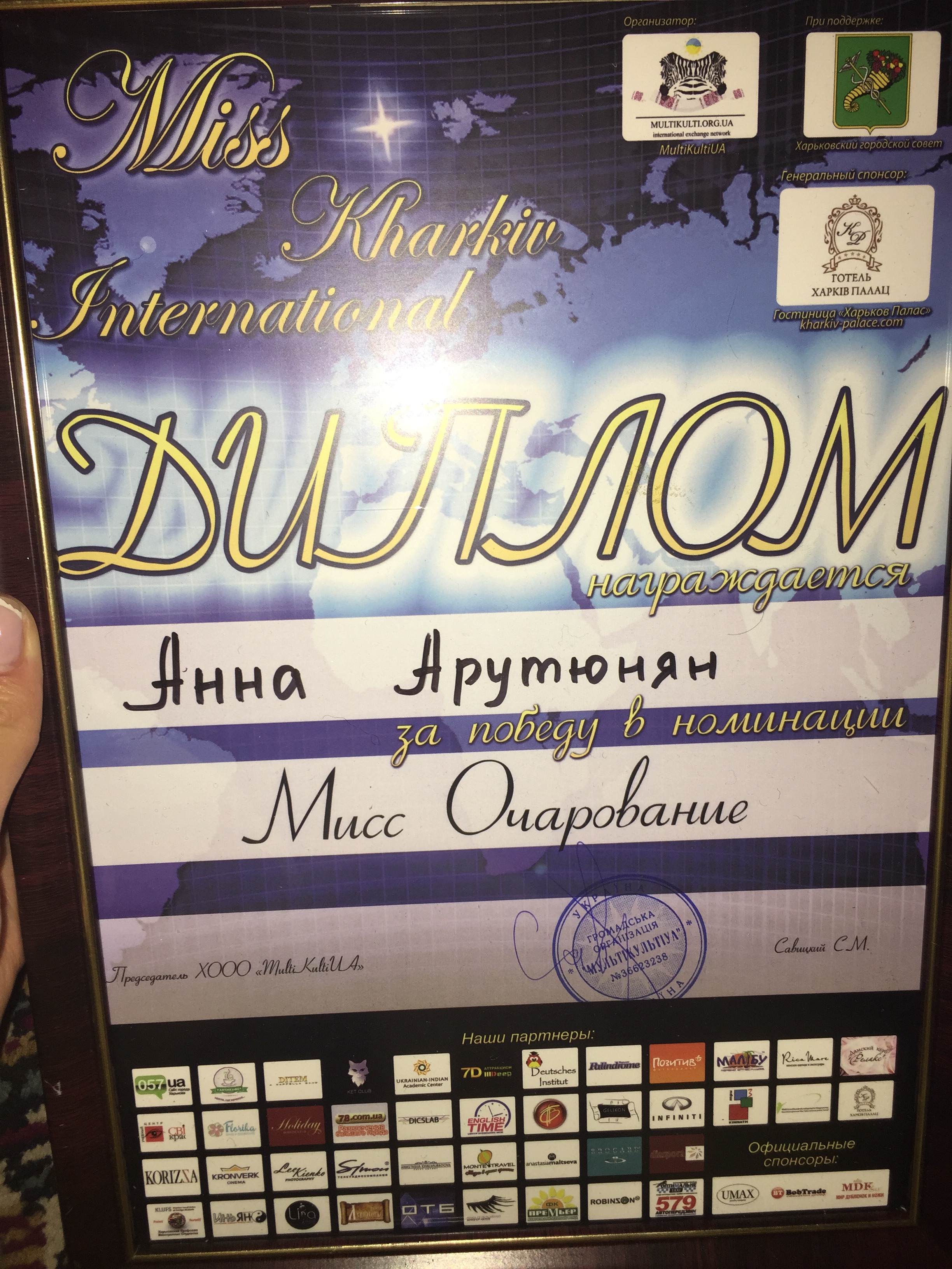 26 березня 2015 року у Харкові в готелі «Прем’єр Палас Готель Харків» з ініціативи обласної організації MultiКultiUA та за підтримки Харківської міської ради відбувся конкурс краси «MissKharkivInternational», учасницями якого стали представниці Азербайджану, Афганістану, Вірменії, Греції, Грузії, Ізраїлю, Індії, Казахстану та Кореї. Захід проводиться з метою показу багатства і різноманіття національно-культурних спільнот Харкова та розкриття теми толерантності у суспільному житті. Серед призерок конкурсу — студентка нашої кафедри, представниця Вірменії Анна Арутюнян, яка отримала титул другої віце-міс. Вітаємо красуню й зичимо успіху у творчих починаннях! |
