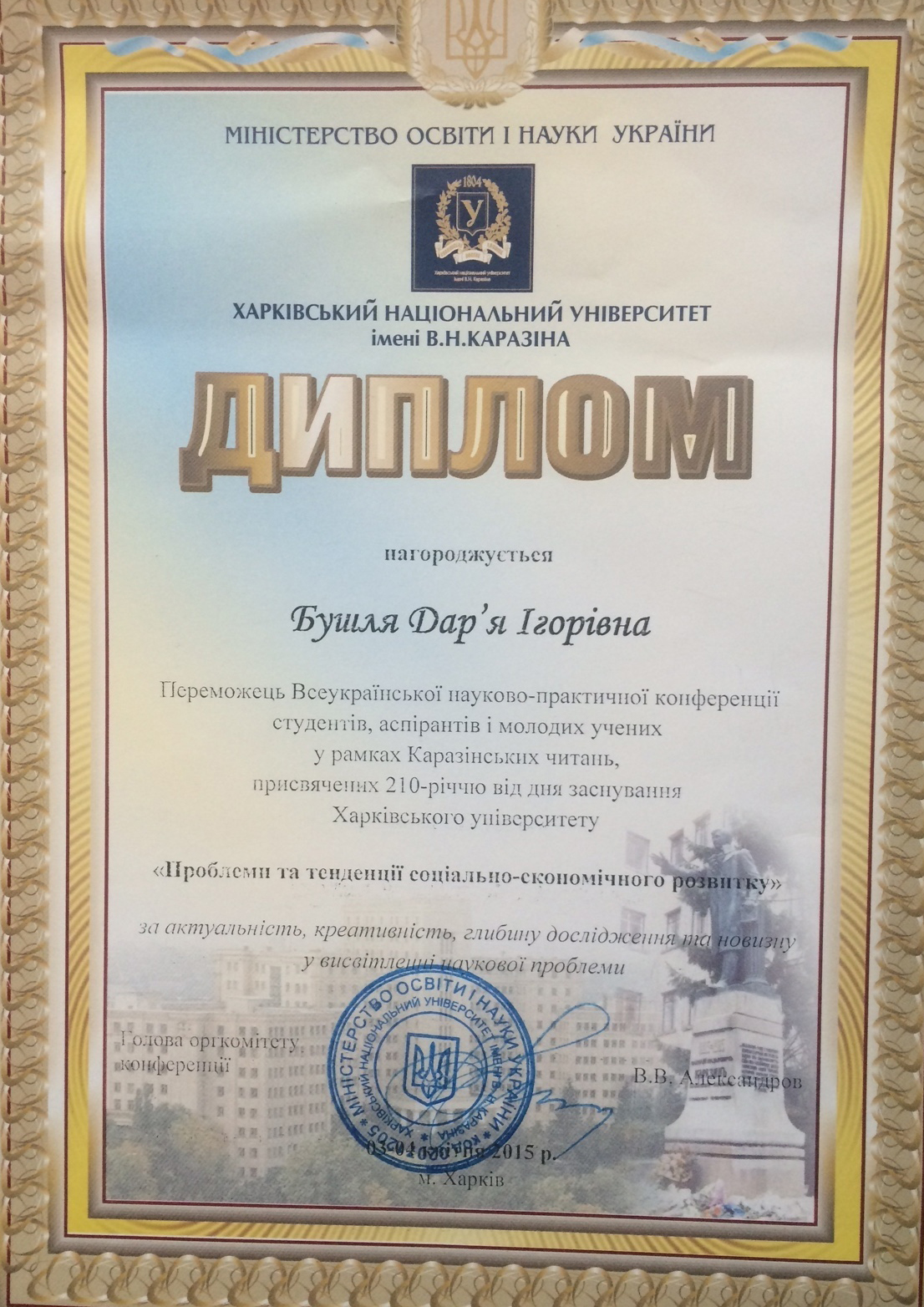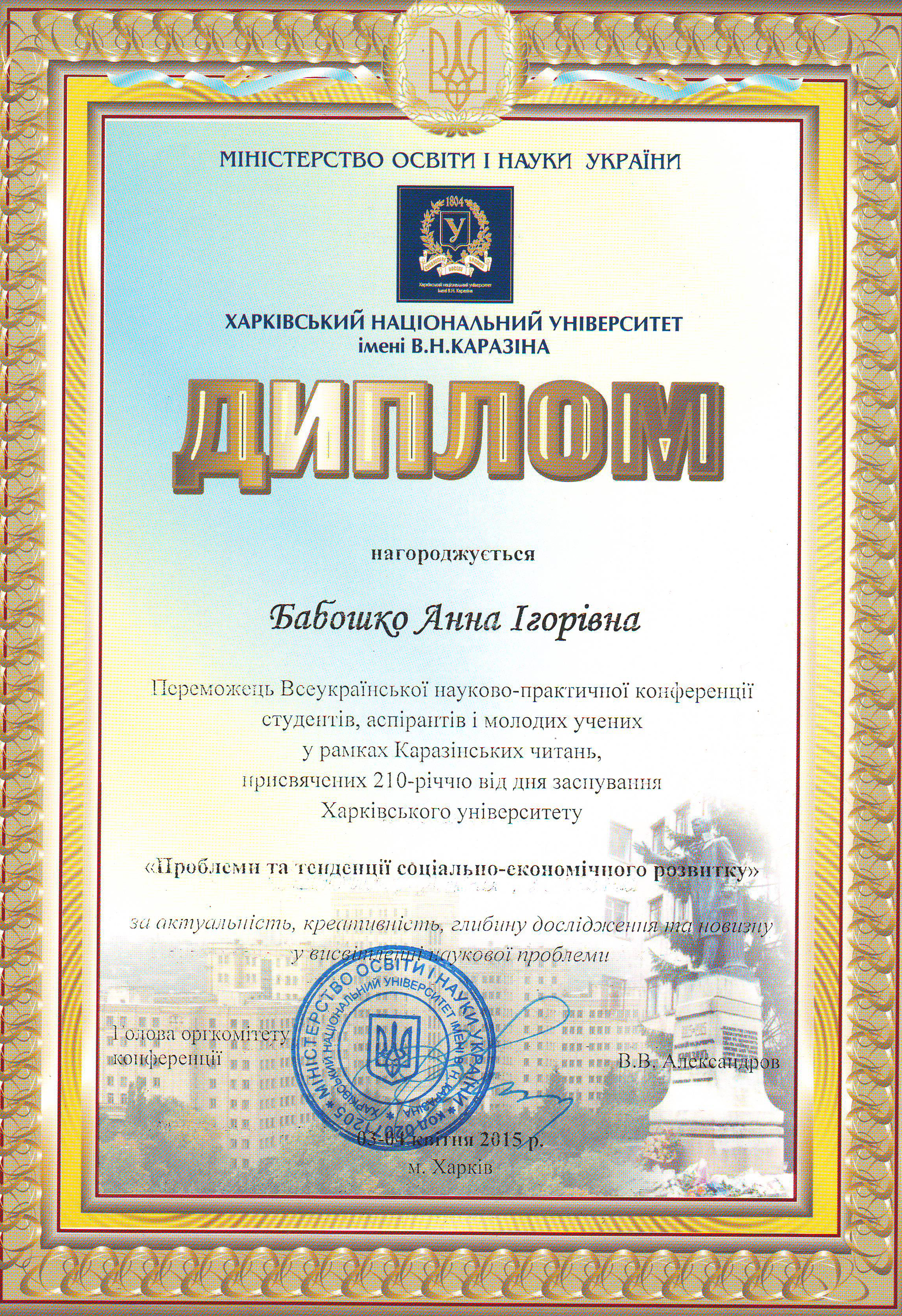 Студентка економічного факультету Харківського національного університету імені В.Н. Каразіна Колосовська Олександра Дмитрівна (гр. ЕВ-42) стала переможцем Всеукраїнського конкурсу студентських наукових робіт 2016-2017 навчального року (диплом ІІ ступеня) за напрямом «Туризм». Презентація відбулась у Львівському інституті економіки і туризму на підсумковій конференції 16 березня 2017 року.