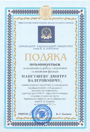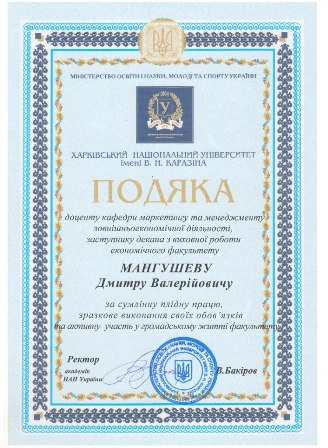Вітаємо Дмитрія Валерійовича Мангушева з отриманням Подяки від ректора Харківського національного університету імені В.Н. Каразіна В.С. Бакірова за захист територіальної цілісності і незалежності України!