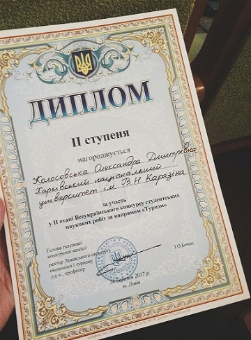 Студентка спеціальності менеджмент зовнішньоекономічної діяльності – переможець Всеукраїнського конкурсу студентських наукових робіт 2016-2017 навчального року (диплом ІІ ступеня) за напрямом «Туризм»