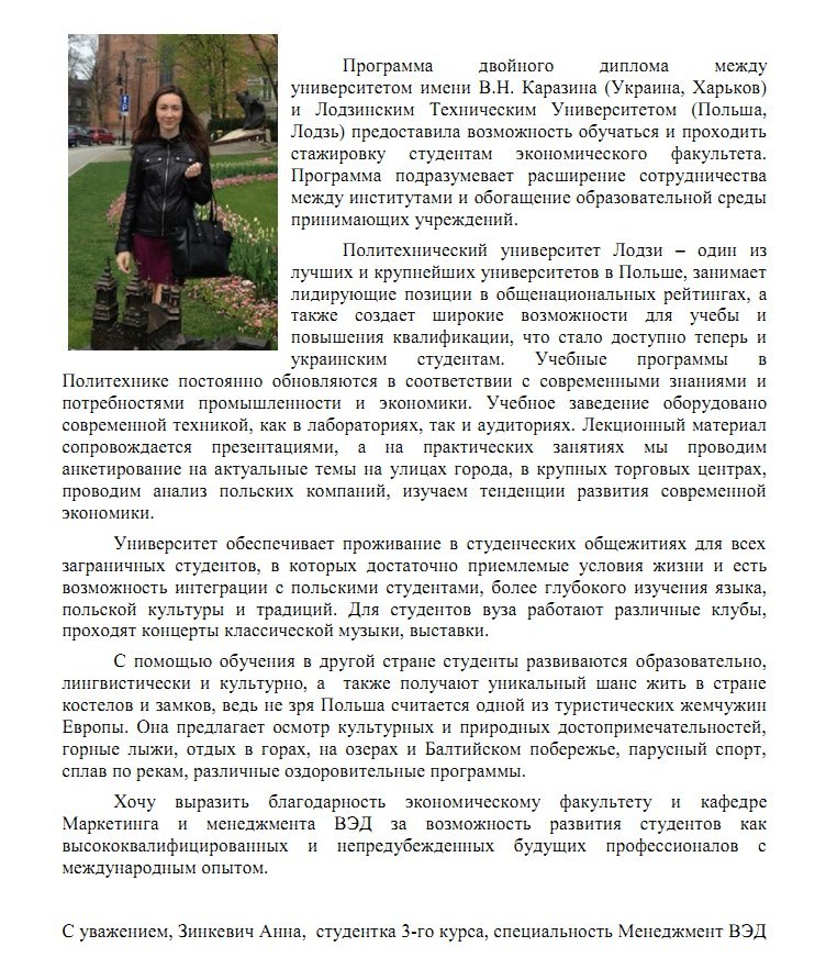 Ганна Зінкевич – студентка 3-го курсу спеціальності «Менеджмент зовнішньоекономічної діяльності». Зараз вона успішно проходить навчання у Польщі в Лодзькому Технічному Університеті в рамках програми отримання подвійного диплому.