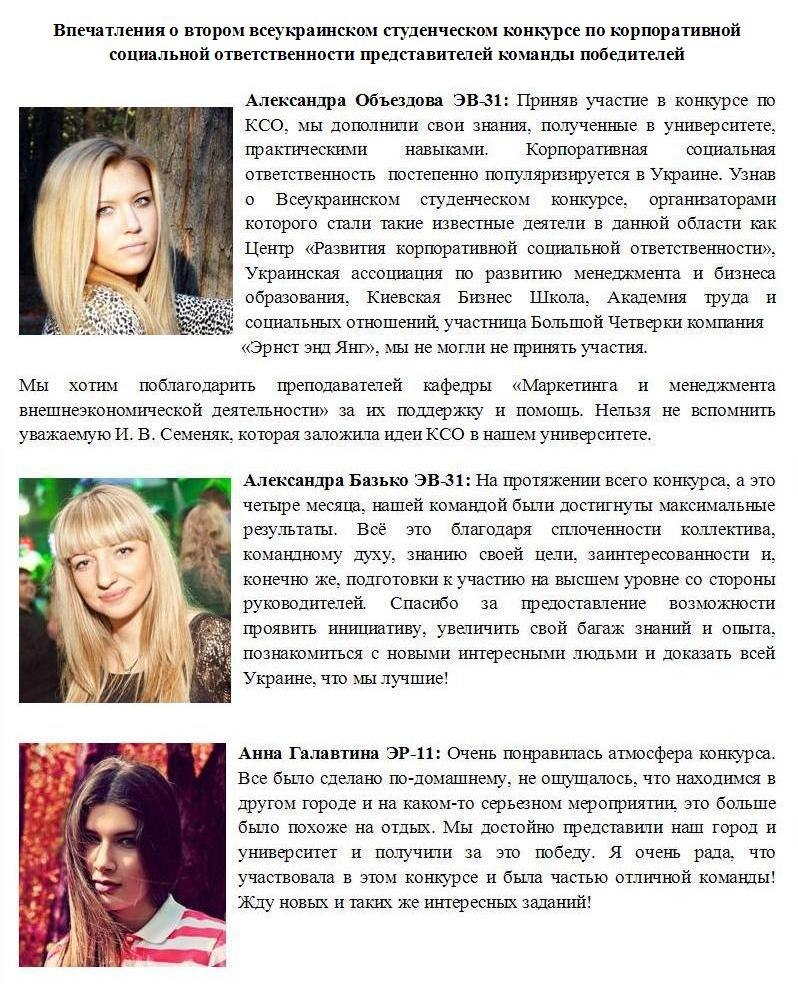 Вітаємо команду студентів нашої кафедри з перемогою у 2-му всеукраїнському студентському конкурсі з корпоративної соціальної відповідальності! Команда переможців: Галавтіна А. ЕВ-11, Базько А. ЕВ-31, Об'ездова А. ЕВ-31, Беззубенко Д. ЕВ-31, Балагезьян Л. ЕР-41. Керівники: Євтушенко В.А., Шевченко Т.П.
