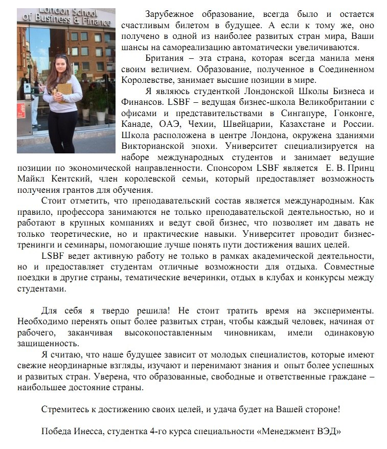 Победа Інеса, студентка 4-го курсу спеціальності «Менеджмент ЗЕД», отримує паралельно диплом Лондонської Школи Економіки та Фінансів. Вона ділиться з нами своїми враженнями про навчання.
