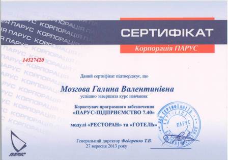 Після проходження відповідного курсу навчання Мозговою Г.В. отриманий сертифікат користувача ПО «Парус-Підприємство 7.40» модулів «Ресторан» та «Готель», що дозволить надати студентам можливість навчання використанню програмного забезпечення з галузевою специфікою. Крім того, планується впровадити в навчальний процес CRM-системи «Парус – Реклама» та «Парус - CRM для туристичного бізнесу».