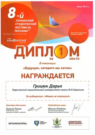 Студентка 5 курсу, яка навчається у магістратурі за спеціальністю «Маркетинг», Дар'я Грицюк зайняла 1 місце на 8-му Всеукраїнському студентському фестивалі реклами у номінації «Майбутнє, якого ми хочемо». Тема відео «Спорт - задоволення, за яке можна не платити». Керівник – старший викладач кафедри маркетингу та менеджменту ЗЕД Пересипкіна