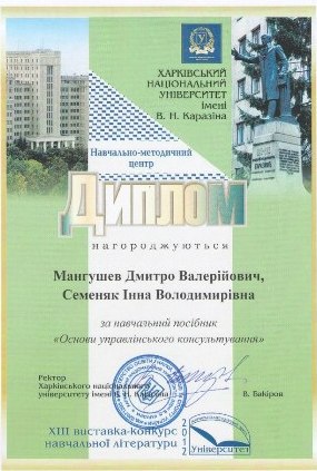 Навчальний посібник І. В. Семеняк і Д. В. Мангушева «Основи управлінського консультування», який вийшов у вересні 2012 року, відзначено дипломом Науково-методичного центру ХНУ імені В. Н. Каразіна на XІІІ виставці-конкурсі навчальної літератури.