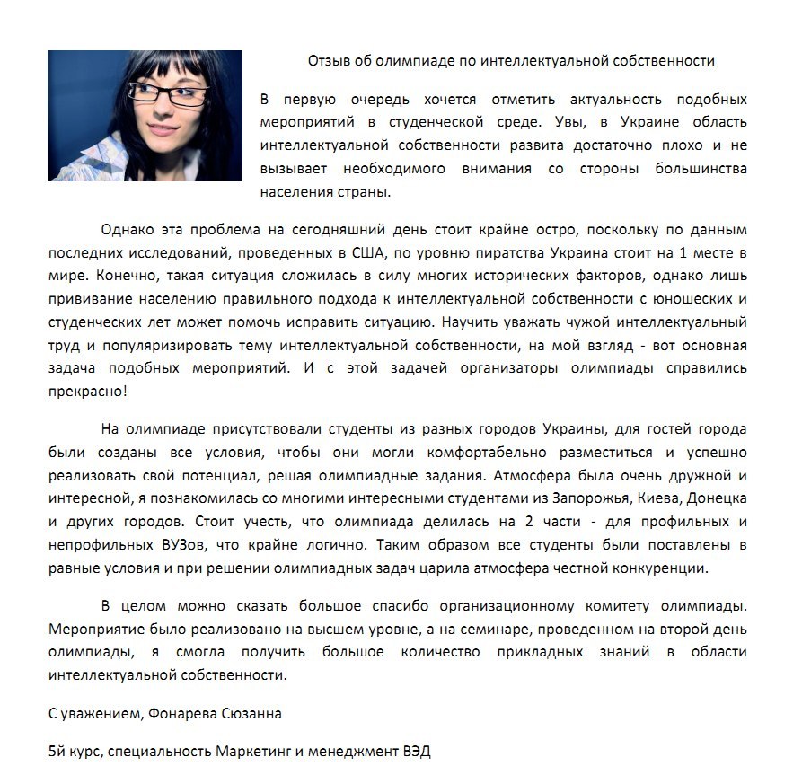 Вітаємо переможницю II етапу Всеукраїнської олімпіади з інтелектуальної власності Фонарьову Сюзанну!!! Бажаємо подальших успіхів і перемог!