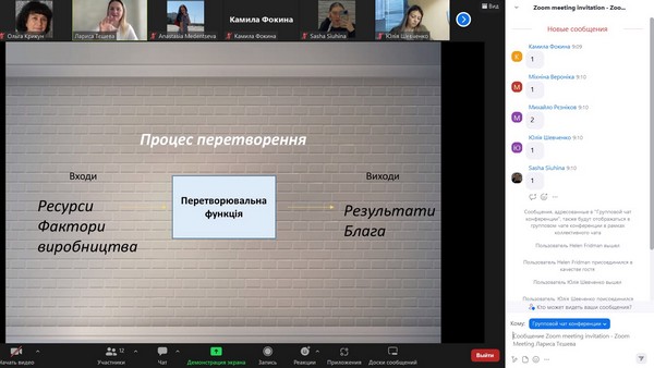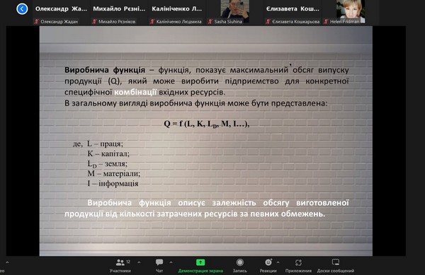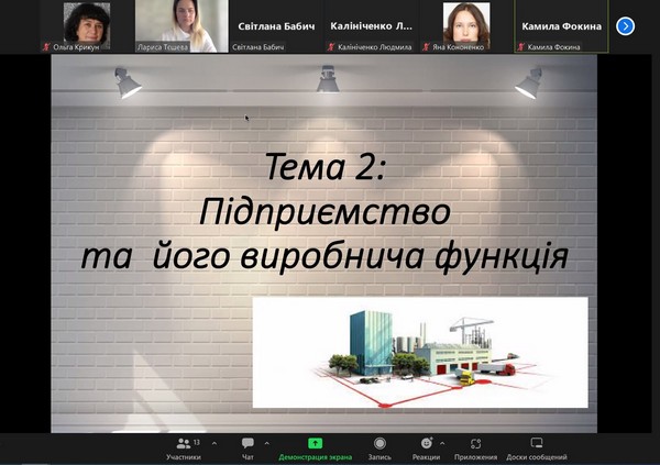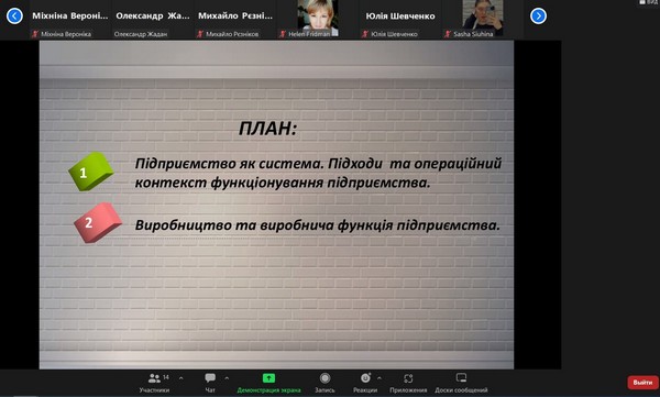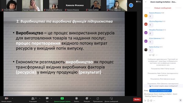 13.09.2023 р. 13 вересня 2023 р. професор закладу вищої освіти кафедри економіки та менеджменту Лариса Василівна Тєшева провела відкриту лекцію з дисципліни «Виробничий менеджмент» для студентів 2 курсу економічного факультету освітньо-професійної програми «Менеджмент бізнес-процесів» на тему «Підприємство та його виробнича функція». Лекція відбулася на платформі ZOOM. На лекції були присутні члени кафедри економіки та менеджменту, зокрема: завідувач кафедри, д.е.н, проф. Г.О. Дорошенко; д.н держ. упр., проф. О.В. Жадан; д.е.н, проф. Л.Л. Калініченко; к.е.н., доцент С.М. Бабич; к.е.н., доцент О.О. Крикун; к.е.н., доцент О.О. Фрідман; к.е.н., доцент Я.В. Кононенко та член науково-методичної комісії від кафедри міжнародної економіки та міжнародного господарства старший викладач Є.Л. Кошкарьова. Поставлена дидактична мета лекції була досягнута. Лекція проведена на високому науково-методичному рівні та повністю відповідає вимогам сучасної вищої школи.