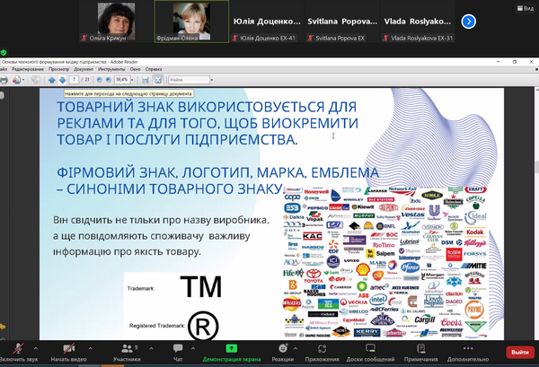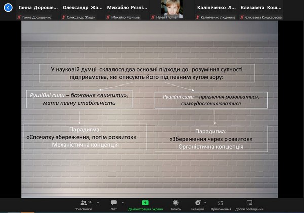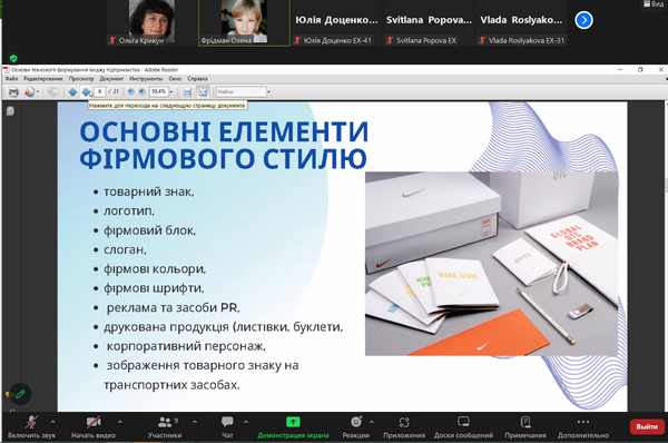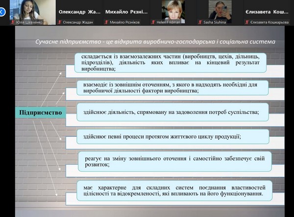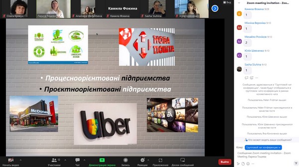 01.11.2023 р. 01 листопада 2023 р. доцент закладу вищої освіти кафедри економіки та менеджменту Олена Анатоліївна Фрідман провела відкриту лекцію з дисципліни «Управління іміджем підприємства» для студентів 4 курсу економічного факультету освітньо-професійної програми «Менеджмент бізнес-процесів» на тему «Основи технології формування іміджу підприємства». Лекція відбулася на платформі ZOOM. На лекції були присутні члени кафедри економіки та менеджменту, зокрема: завідувач кафедри, д.е.н, проф. Г.О. Дорошенко; д.е.н., доцент Л.В. Тєшева; викладач Чужданова М.В. та члени науково-методичної комісії економічного факультету к.е.н., доцент О.О. Крикун, к.е.н., доцент кафедри маркетингу, менеджменту та підприємництва Т.П. Шуба.