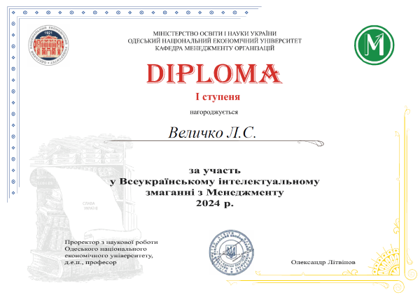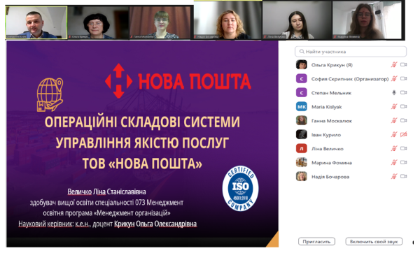 У конкурсі приймало участь 39 закладів вищої освіти України та подано 87 наукових робіт, які пройшли відповідну експертизу і рецензування. Змагання проходило у вигляді наукових статей за результатами наукових досліджень та доповідей студентів з презентацією наукових результатів. У змаганні приймала участь здобувач вищої освіти 3-го курсу освітньої програми «Менеджмент організацій» ВЕЛИЧКО ЛІНА. Під науковим керівництвом к.е.н., доцента Крикун О.О. була підготовлена наукова робота на тему «Операційні складові системи управління якістю послуг ТОВ «Нова пошта». У формі підсумкової науково-практичної відео-конференції, Ліна презентувала результати наукового дослідження, за що отримала Диплом І ступеня серед конкурсантів інтелектуального змагання.