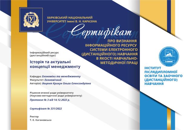 13.03.2023 Викладачі кафедри постійно вдосконалюють навчально-методичні комплекси дисциплін. Інститутом післядипломної освіти та заочного (дистанційного) навчання були сертифіковані і визнані в якості навчально-методичної праці наступні дистанційні курси: Перший (бакалаврський) рівень вищої освіти 1. Історія та актуальні концепції менеджменту, видано сертифікат № 331/2022 протокол №3 від 14.12. 2022 р., к.е.н., доценту Крикун Ользі Олександрівні.