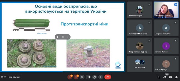13.09.2023 р. В рамках кураторської години 13 вересня 2023р. об 13:30 відбувся захід з навчання ризиків щодо вибухонебезпечних предметів. Навчання проводила Handicap International (Humanity & Inclusion) — міжнародна незалежна та неупереджена гуманітарна організація. Цим заходом було передбачено навчання ризикам, пов’язаним з вибухонебезпечними предметами (EORE), а також підготовку до конфліктів та захисту (CPP).