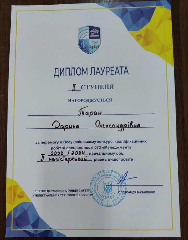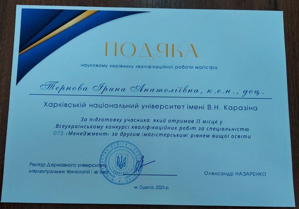 14.10.2023 р. З 27 по 29 вересня 2023 року в Державному університеті інтелектуальних технологій і зв’язку (м. Одеса) відбувся Всеукраїнський конкурс кваліфікаційних робіт здобувачів вищої освіти зі спеціальності 073 «Менеджмент». За результатами конкурсу випускниця кафедри економіки та менеджменту освітньо-професійної програми «Менеджмент організацій» другого (магістерського) рівня вищої освіти стала переможцем. Дарина ТАРАН нагороджена дипломом переможця II ступеня, тема кваліфікаційної роботи магістра «УДОСКОНАЛЕННЯ СИСТЕМИ РЕКРУТИНГУ ТА HR-ПРОЦЕСІВ IT-КОМПАНІЇ (НА ПРИКЛАДІ ТОВ «ІНСОФТ УКРАЇНА»)», науковий керівник – канд. екон. наук, доцент ЗВО кафедри економіки та менеджменту Ірина ТЕРНОВА. Пишаємося вагомими здобутками та бажаємо креативних ідей, інтелектуальних перемог та звершень!