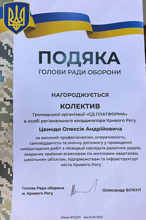 03.08.2023 р. Часи небайдужості Цвинда Олексій, студент 4 курсу і координатор громадської організації «СД Платформа» у Кривому Розі зі своєю командою отримали подяку від Криворізької міської ради за високий професіоналізм, оперативність, самовідданість та значну допомогу у проведенні невідкладних робіт з ліквідації наслідків ракетних ударів, завданих країною-агресором по житлових кварталах, цивільних об‘єктах, підприємствах та інфраструктурі міста Кривого Рогу. 13 червня 2023 року була чергова атака по житлових будинках, після якої Олексій зі своєю командою одразу почали допомагати мешканцям, запустивши збір коштів з подальшою закупівлею всього необхідного для життєдіяльності постраждалих. Кожна така дія небайдужих студентів наближає до нашої Перемоги!