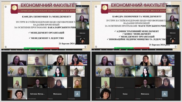 21.03.2024 року Зустріч зі стейкхолдерами з обговорення освітніх програм кафедри економіки та менеджменту 21 березня 2024 року відбулася зустріч зі стейкхолдерами щодо обговорення освітньо-професійних програм бакалаврського рівня: «Менеджмент організацій», «Менеджмент і лідерство» та освітньо-професійних програм магістерського рівня: «Менеджмент організацій», «Бізнес-менеджмент», «Адміністративний менеджмент» та освітньо-наукової програми «Інноваційне підприємництво та менеджмент». Гаранти освітньо-професійних програм кафедри запрошують стейкхолдерів до активної участі на всіх етапах реалізації освітнього процесу: ознайомлення, обговорення, внесення пропозицій при розробці освітніх програм та навчальних планів; залучення стейкхолдерів до проведення публічних лекцій та практичних занять; проведення практик на підприємствах, що є потенційними роботодавцями для здобувачів вищої освіти; укладення договорів на проведення стажування викладачів з метою підвищення кваліфікації; реалізація дуальної форми навчання з подальшим працевлаштуванням здобувачів вищої освіти. На зустрічі обговорили головні тенденції, зміни та вимоги до випускників на ринку праці. Розглянули зміну компонентних складових освітніх програм та нові вимоги до формування компетенцій здобувачів вищої освіти з урахуванням потреб роботодавців та змін на ринку праці, що спричинені збройною агресією російської федерації̈ проти України.