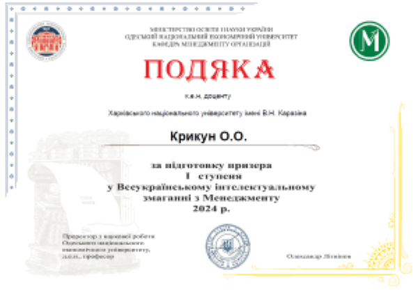 Другий (магістерський) рівень вищої освіти 1. Самоменеджмент, видано сертифікат № 347/2023 протокол №5 від 15.22. 2023 р., к.е.н., доценту Крикун Ользі Олександрівні.