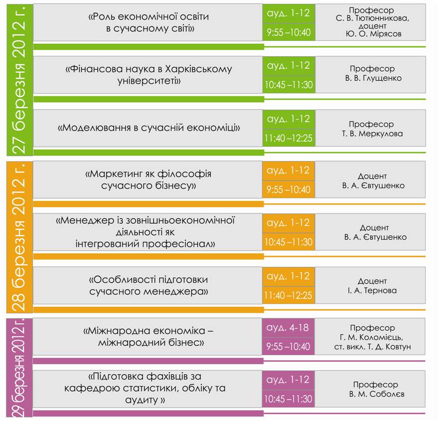Цикл популярних лекцій з економікиАбітурієнти! Запрошуємо Вас у дні весняних шкільних канікул 27, 28 і 29 березня 2012 року на безкоштовний Цикл популярних лекцій з економіки. Лекції будуть проводитись у навчальному корпусі факультету за адресою вул. Мироносицька, 1. Приходьте буде цікаво!