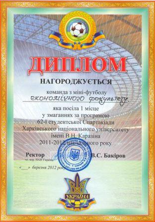 Вітаємо збірну команду економічного факультету, яка посіла 1 місце у змаганнях з міні футболу за програмою 62-ї студентської Спартакіади Харківського національного університету імені В. Н. Каразіна 2011/2012 навчального року
