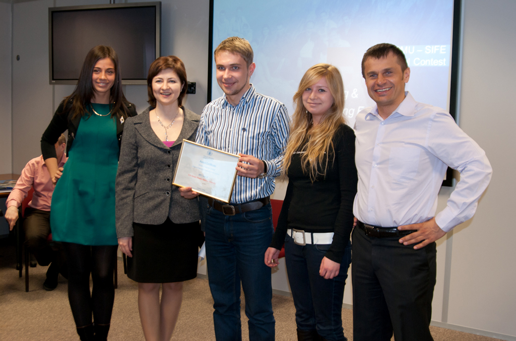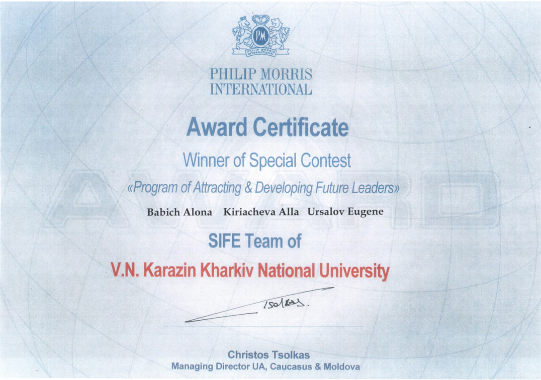 Команда економічного факультету ХНУ перемогла у програмі SIFE . 24 лютого 2012 р. в рамках програми SIFE (Students in free enterprise) компанією Філіп Морріс був проведений спеціальний конкурс «Побудова стратегії підбору та адаптації лідерів майбутнього». У конкурсі прийняли участь 8 команд з різних ВНЗ України. На думку керівництва компанії команда SIFE ХНУ ім. В.Н. Каразіна, яку представили Бабич Альона, Кірячева Алла та Урсалов Євген, блискуче презентувала свій проект, показала високий рівень та вільне володіння англійської мови та вразила своїми провідними ідеями. 20 березня 2012 р. було оголошено результати: переможцем спецконкурсу за рішенням компетентного журі, що складалось з керівників Філіп Морріс, було обрано команду SIFE Харківського національного університету ім. Каразіна. Під час нагородження генеральний директор ФМ Україна, Молдова та Казахстан Христос Цолкос вручив команді міжнародний сертифікат та грошове винагородження. Вітаємо команду SIFE ХНУ ім. В.Н.Каразіна з перемогою та бажаємо подальших успіхів.