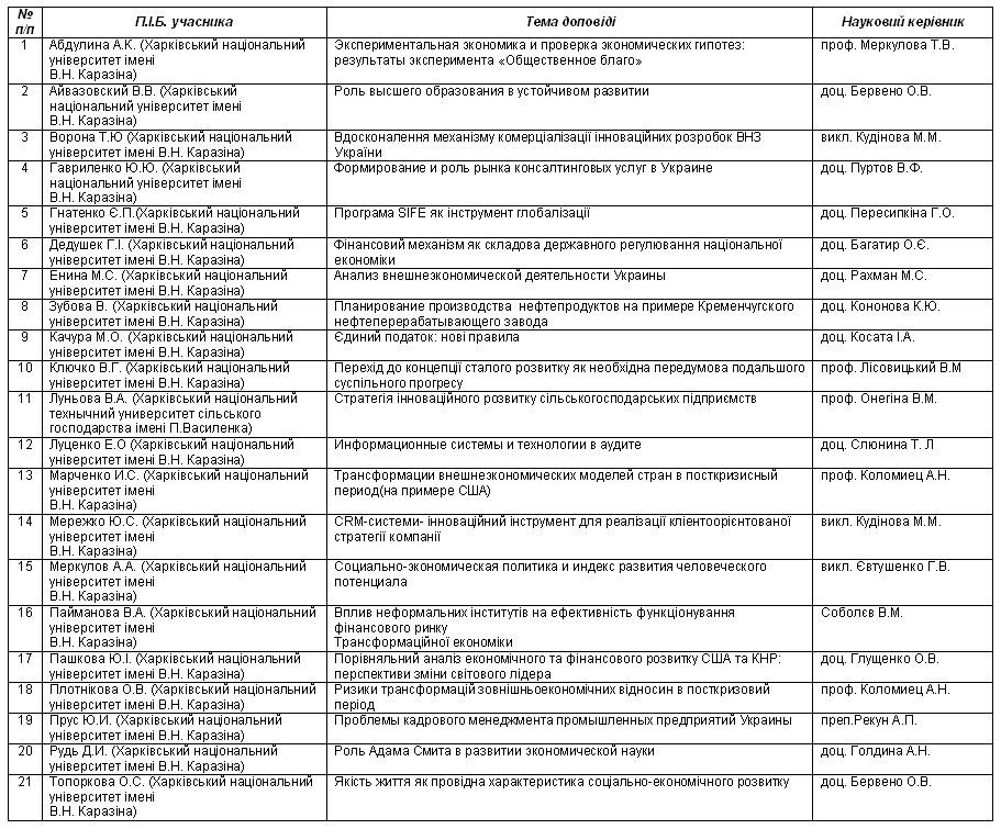 Члени оргкомітету: Антоненко Л.А. – проф. кафедри економіки та менеджменту. Бабич В.П. – проф., завідувач кафедри економіки та менеджменту. Глущенко В.В. - проф., завідувач кафедри фінансів та кредиту.