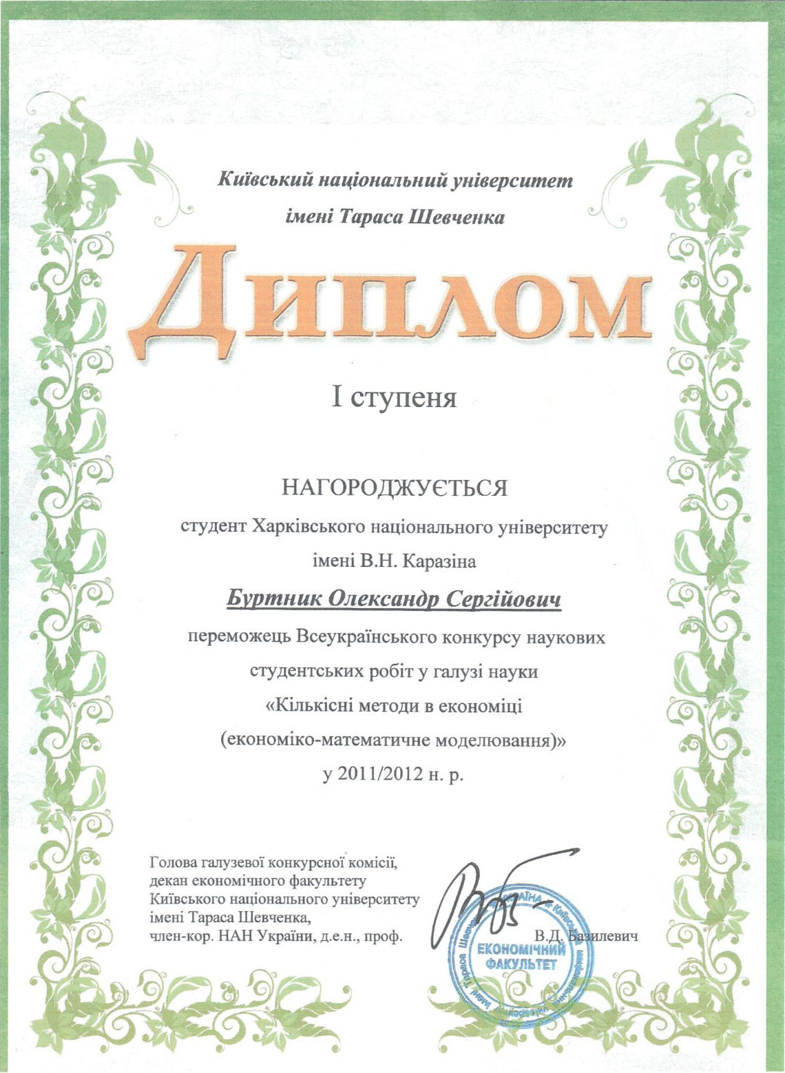 Студенти економічного факультету стали переможцями на Всеукраїнському конкурсі студентських наукових робітЗа підсумками Всеукраїнського конкурсу студентських наукових робіт у 2011/2012 навчальному році 1. Буртника Олександра Сергійовича у галузі науки «Кількісні методи в економіці», (Київський національний університет імені Тараса Шевченко) ДИПЛОМ І СТУПЕНЯ (Науковий керівник: д.е.н., проф. Меркулова Т.В.)