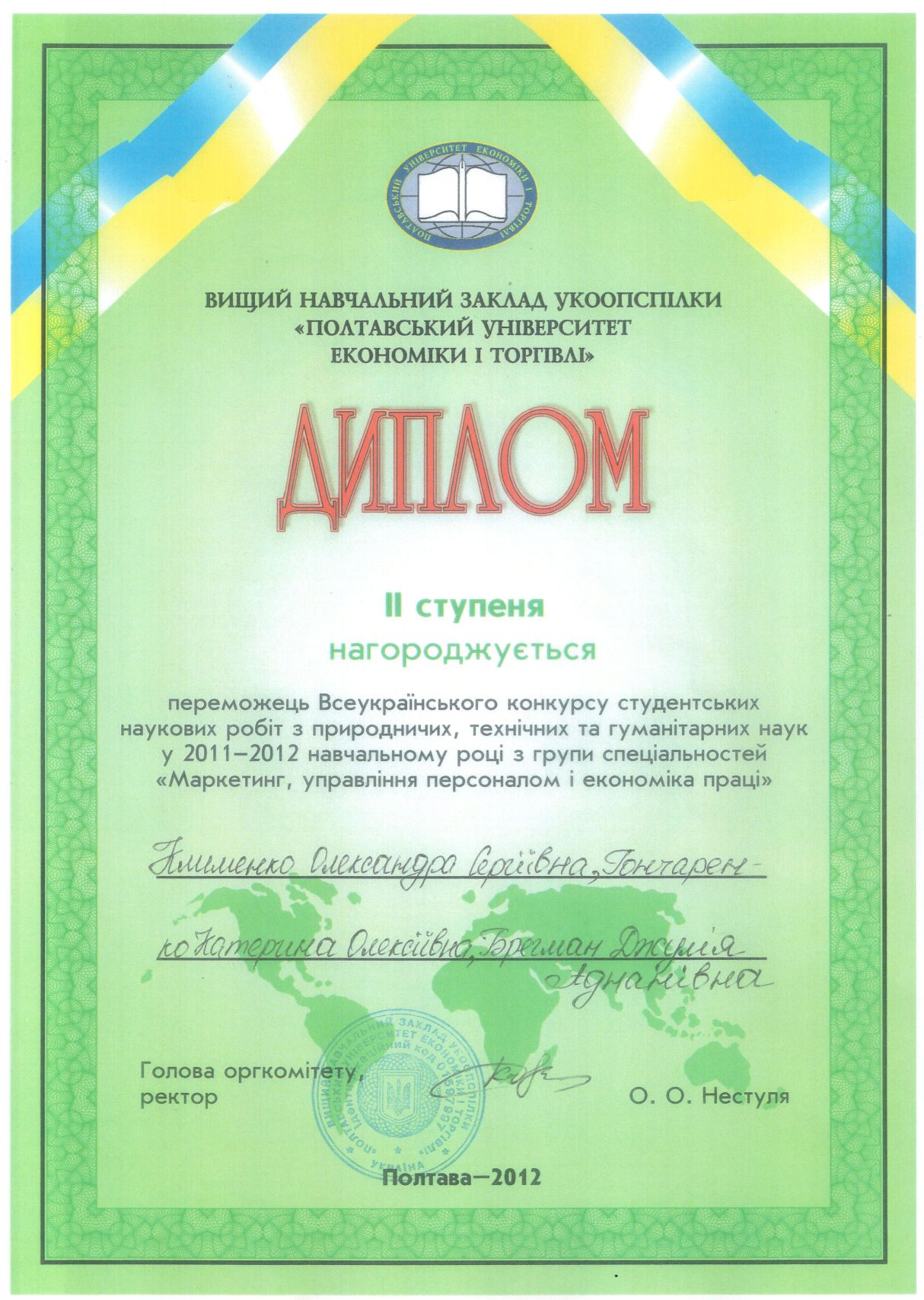 2. Кліменко Олександри Сергіївни, Гончаренко Катерини Олексіївни, Брегман Джулії Аднанівни у галузі науки «Маркетинг», (Полтавський університет економіки і торгівлі) ДИПЛОМ ІІ СТУПЕНЯ (Наукові керівники: д.е.н., проф. Коломієць Г.М., ст. викл. Дідорчук І.Л.)