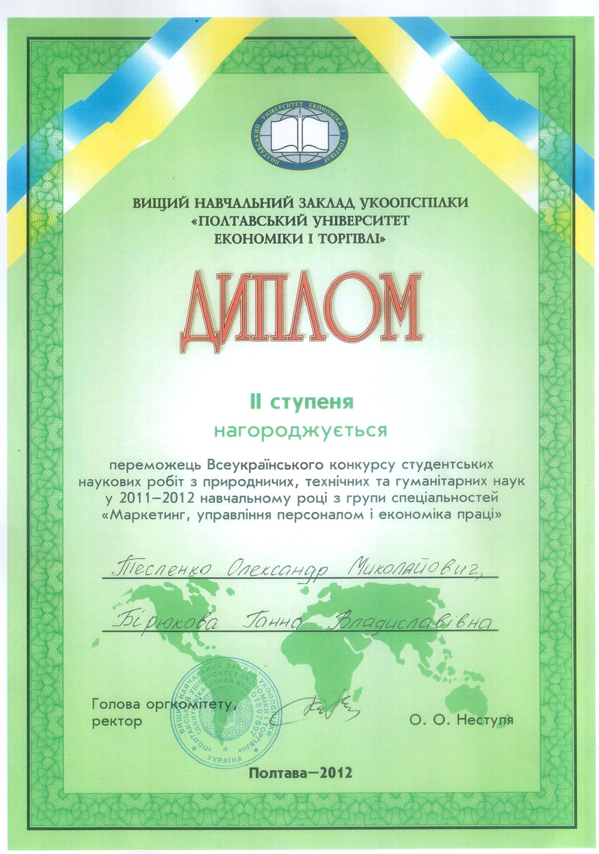 3. Бірюкової Ганни Владиславівни, Тесленко Олександра Михайловича у галузі науки «Маркетинг», (Полтавський університет економіки і торгівлі) ДИПЛОМ ІІ СТУПЕНЯ (Наукові керівники: д.е.н., проф. Коломієць Г.М., ст. викл. Дідорчук І.Л.)