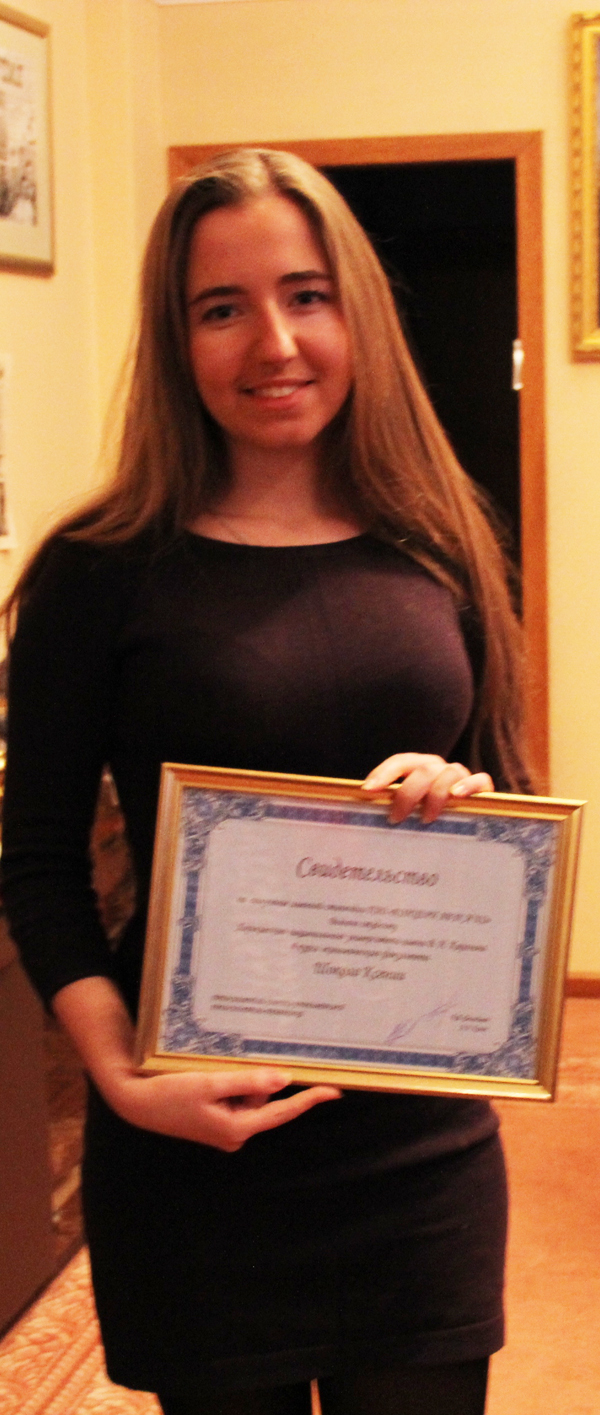 Вручення іменної стипендії від фонду Олександра ФельдманаВручення свідоцтва іменної стипендії від фонду Олександра Фельдмана, студентці 4го курсу, спеціальності "Міжнародна економіка", ХНУ ім.В.Н. Каразіна - Шокало Ксенії.