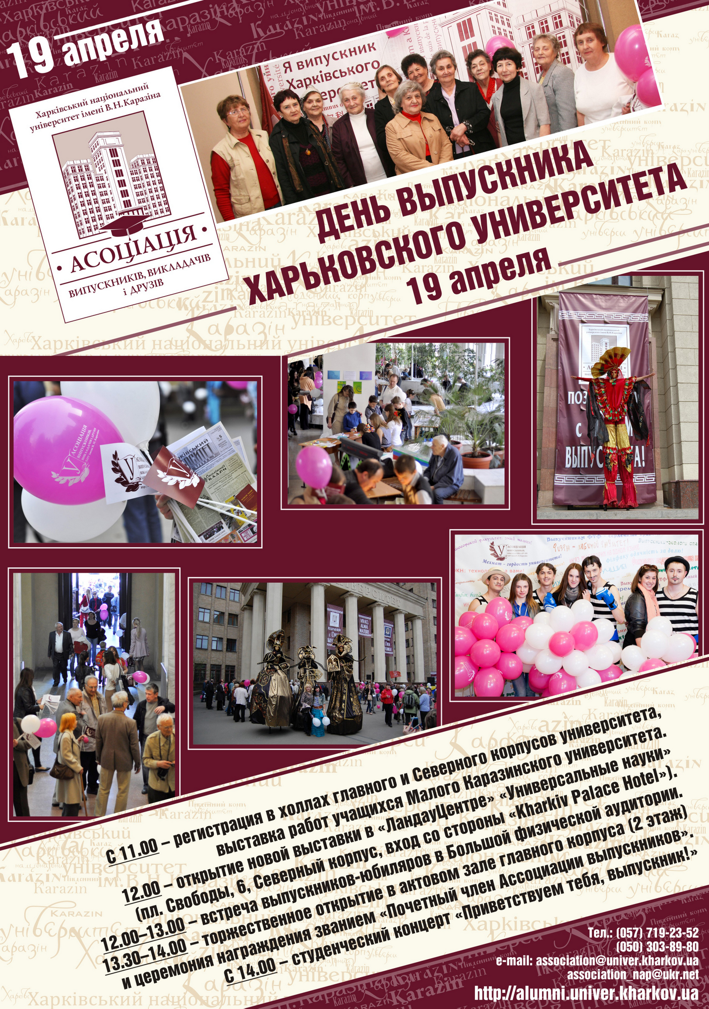ДЕНЬ ВЫПУСКНИКА 2014Шановні випускники економічного факультету Харківського національного університету імені В.Н. Каразіна! Запрошуємо Вас прийняти участь у зустрічі випускників, яка відбудеться в навчальному корпусі економічного факультету 19 квітня 2014 року з 11.00 до 12.30 в ауд. 2-14 за адресою: вул. Мироносицька 1.