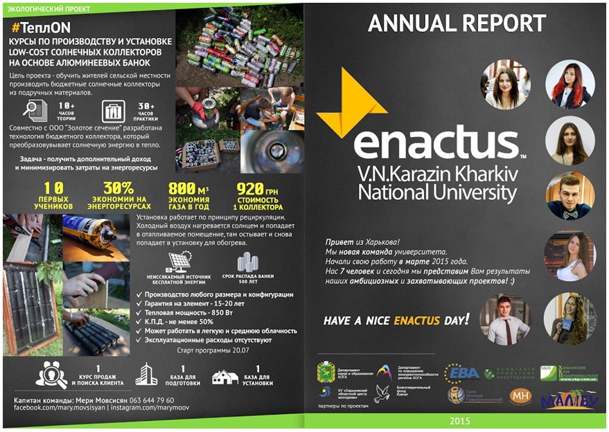 Відбулися національні змагання Enactus9 липня 2015 року в Києві відбулися національні змагання Enactus, на якому команда Харківського національного університету імені В.Н. Каразіна у складі студентів економічного факультету (Урсалов Євген, Мовсісян Мері, Молодцова Аніта, Кішкар Артем, Бондаренко Анастасія) вийшла у фінал та здобула бронзовий кубок. Команда презентувала 3 проекти, спрямовані на покращення економічних, екологічних та соціальних факторів.