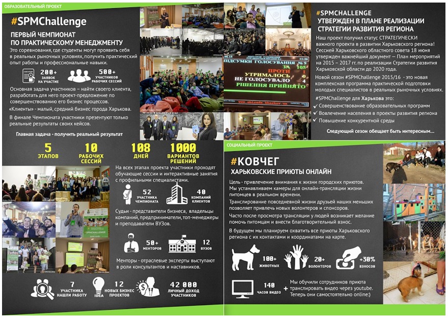 Зокрема, перший проект, – чемпіонат з практичного менеджменту під назвою «SPM Challenge», – є освітнім та має на меті досягнення практичних результатів серед студентів ВНЗ Харкова.
