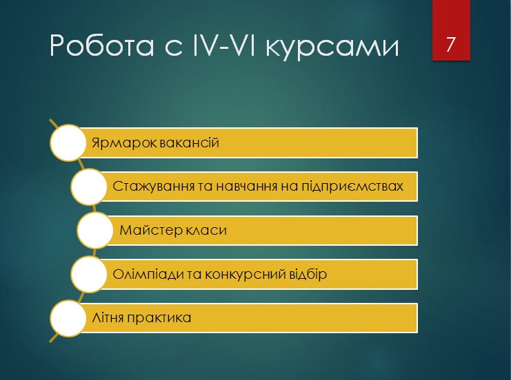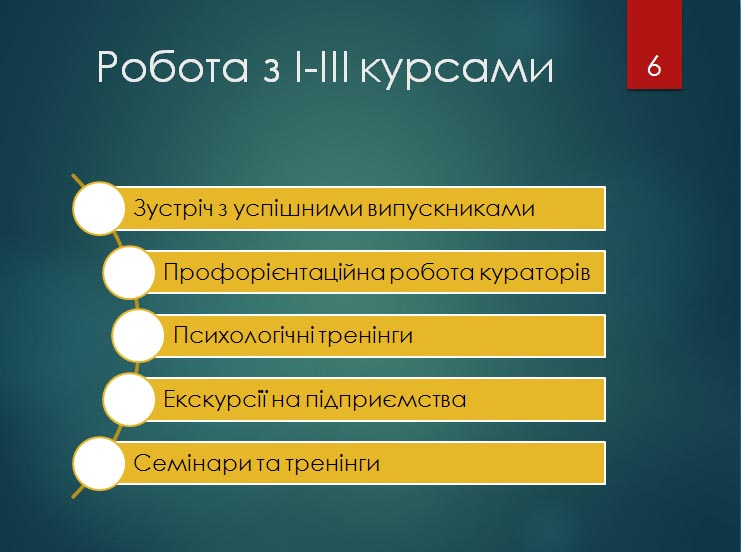 Робота з профорієнтації зі студентами 1-3 курсів включає наступні основні напрямки: зустрічі з успішними випускниками, профорієнтаційна робота кураторів академічних груп, психологічні тренінги, екскурсії на провідні підприємства, семінари та тренінги з працевлаштування.