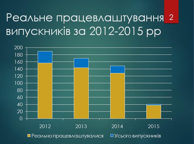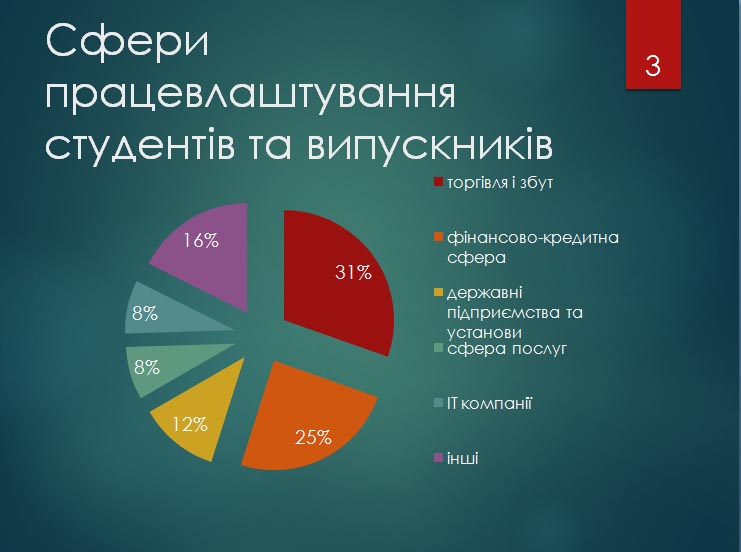За вказаний період найбільша кількість випускників факультету працевлаштувалась у сфери торгівлі і збуту (31%), у фінансово-кредитній сфері (25%). На державні підприємства працевлаштувалися 12% випускників. Сфера послуг прийняла 8% наших випускників, які працевлаштовувались працівниками туристичних агенцій, керівниками і менеджерами готелів, ресторанів, транспортних компаній). 8% випускниківпрацюють в IT-компаніях(це, восновному,випускникиспеціальності «Економічна кібернетика», але є і представники спеціальностей «Маркетинг» і «Менеджмент»). В іншихсферах працелаштувалося 16% випускників (бізнесмени на різноманітних товарних ринках, фрілансери, аспіранти і викладачі в університетах тощо)