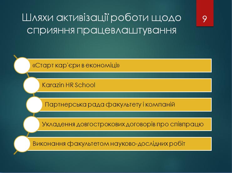 містить низку таких заходів: 1-«Ярмарок вакансій», що зорганізується Центром працевлаштування студентів та випускників Університету, і яку відвідує кожен другий студент старших курсів, 2-стажування і навчання на підприємствах– тут задіяні абсолютно всі студенти у рамках проходження виробничої та переддипломної практик, 3-Дні відкритих дверей та проведення майстер-класів з провідними українськими та міжнародними компаніями, 4-профільні олімпіади та конкурсний відбір роботодавцями кращих студентів випускних курсів (наприклад, банк «Юні Кредит» вже кілька років поспіль на базі факультету проводить відбірковий тур профолімпіади, переможці якої проходять оплачуване річне стажування у Київському офісі), 5-додаткові літні практики, як правило, за кордоном. Особливо слід відзначити досвід роботи з працевлаштування випускників на наступних кафедрах факультету: кафедра економічної кібернетики та прикладної економіки проводить сповіщення студентів і випускників кафедри про наявність вакансій центру зайнятості, сайту «Робота в Харкові» і провідних компаніях роботодавців України, підприємствах, в яких ключові посади займають випускники кафедри, а також викладають цю інформацію на власному інтернет-ресурсі; кафедра міжнародної економіки та світового господарства проводить прикладні дослідження і виконує магістерські роботи з метою отримання навичок розробки бізнес-планів ізахист цих робіт проходить у присутності представників бізнес-середовища з метою подальшого працевлаштування; кафедра економіки та менеджменту щорічно проводить презентації випусників своєї кафедри, а також конкурси –наприклад, кращий випускник спеціальності «Менеджмент організації та адміністрування». Стосовно плідної роботи з роботодавцями, кафедри факультету проводять регулярні зустрічі з керівниками великих підприємств, в тому числі, з колишніми випускниками. В свою чергу, бізнес-структури допомагають підсилити слабкі місця теоретичної підготовки і додати необхідні затребувані навички для сучасного спеціаліста та складають договори про співробітництво.