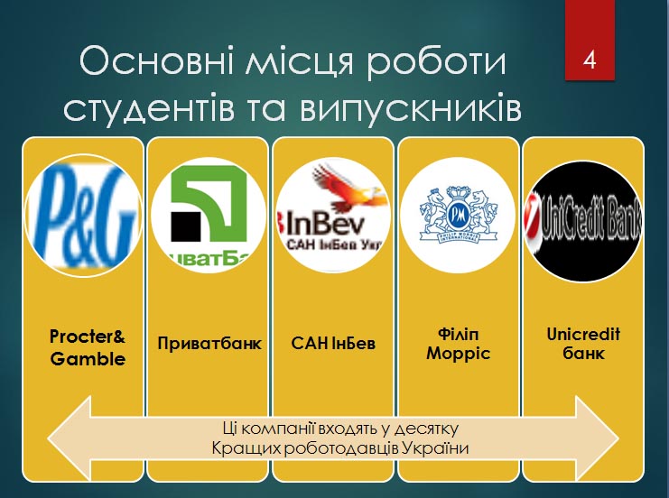 До найбільших роботодавцівдля випускників економічного факультету належать компанії: «Procter&Gamble», «Приватбанк», «UniCreditBank», «PhilipMorris International Inc.», « SUNInBev Ukraine».