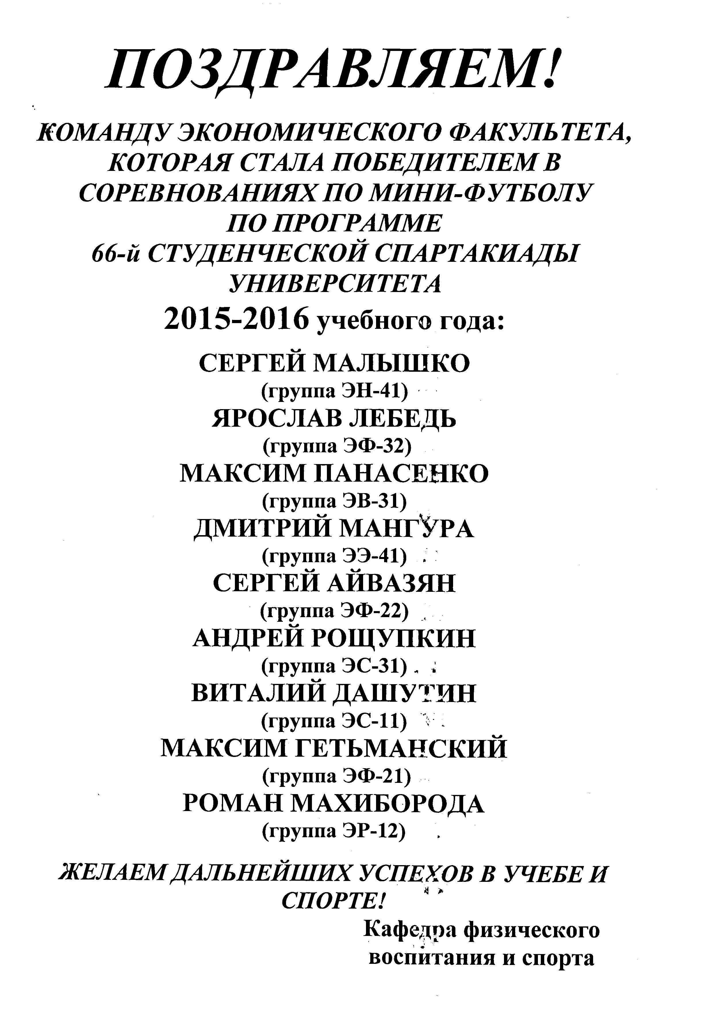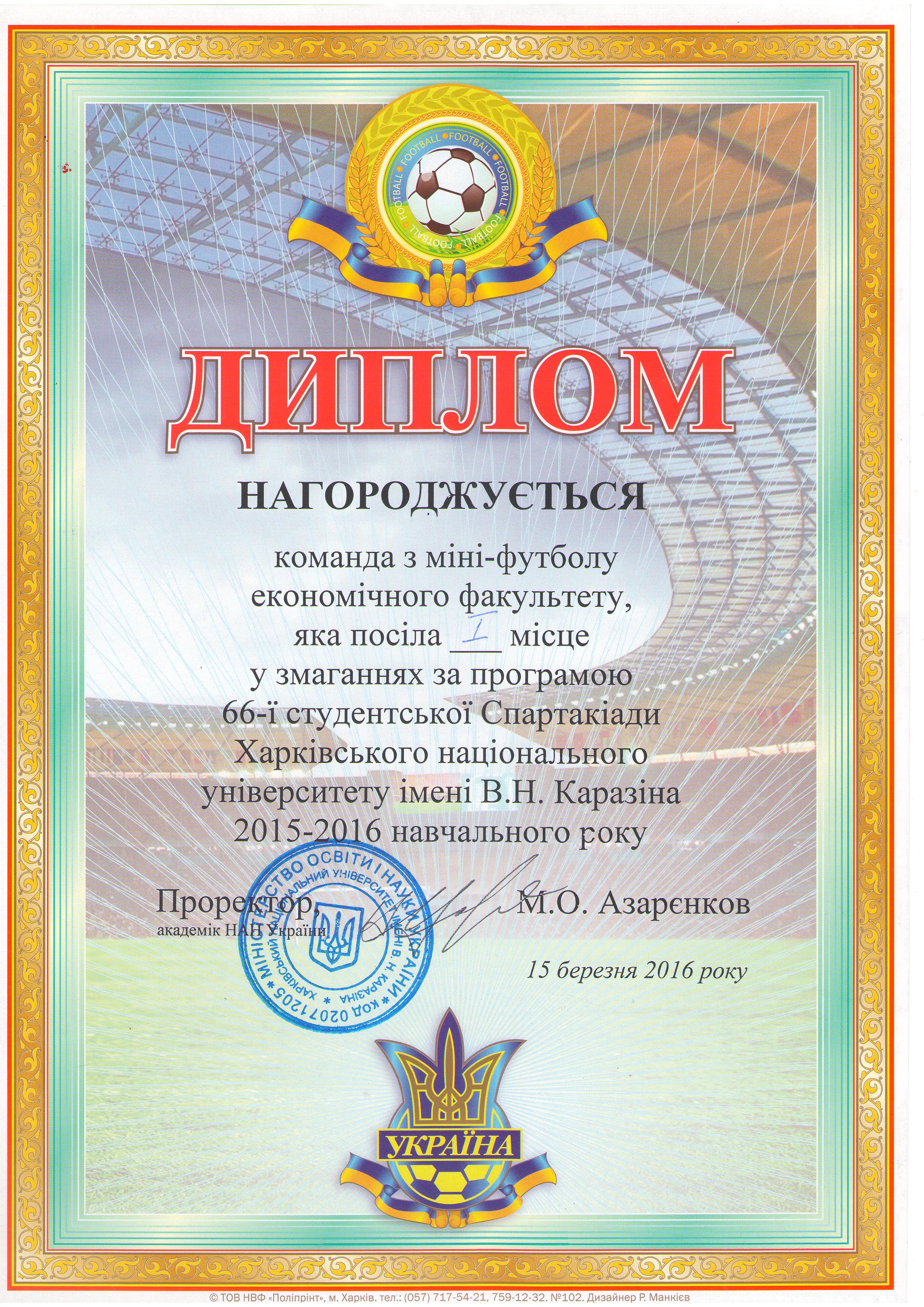 Економічний факультет – переможець!Вітаємо команду з міні-футболу економічного факультету, яка посіла перше місце у змаганнях за програмою 66-ї студентської Спартакіади Харківського національного університету імені В.Н.Каразіна