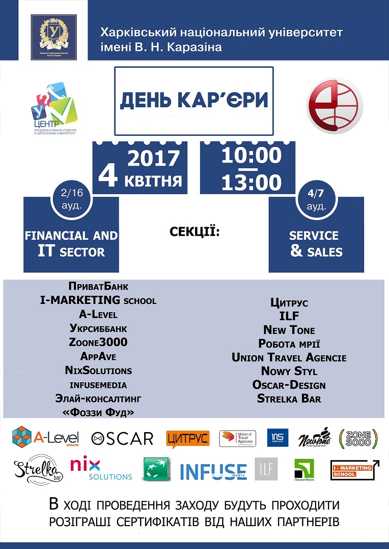 3-7 квітня 2017 року – Тиждень кар’єри3–7 квітня 2017 року у Каразінському університеті за підтримки центру практичної підготовки та працевлаштування університету проходитиме Тиждень кар’єри.