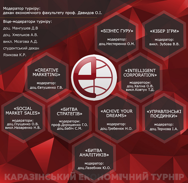Для учасників Турніру зусиллями провідних фахівців та кращих студентів економічного факультету було проведено 7 захоплюючих інтелектуальних бізнес-ігор: - «Бізнес Гуру», під час якої кожній команді у ролі ради директорів необхідно розробити рекомендації стосовно подолання проблем діяльності компанії; - «Управлінські поєдинки» передбачають публічний поєдинок, у рамках якого учасники будуть вести діалог, приводом для якого буде невирішена управлінська ситуація; - «Intelligent corporation» - це гра, в основі якої лежать 5 міні-ігор з географії, англійської мови, математики та діяльності транснаціональних корпорацій; - «Financial challenge» є прикладом моделювання фінансового ринку, який розкриває можливості для поетапної постанови цілей, розуміння організації фінансового обігу; - «Битва аналітиків», передбачає захоплюючі й пізнавальні, креативні, прикладні міні-завдання з пошуку рішень в сфері бізнес-аналітики, статистики, обліку та оподаткування; - «Кібер ігри» передбачать постановку прикладних економічних задач, для яких команди після обговорення повинні розробити рекомендації стосовно їх вирішення. - «Креативний маркетинг» для всіх учасників турніру, у ході якої учасники, вивчивши ринки споживачів, проаналізувавши стратегії просування продукції, розробляють рекламну кампанію товару.