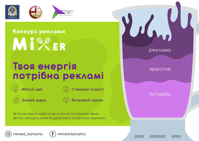 Кафедра маркетингу та менеджменту зовнішньоекономічної діяльності Харківського національного університету імені В. Н. Каразіна запрошує до участі в конкурсі соціальної реклами «MIXer» студентів ВНЗ та учнів 9-11 класів. Тема конкурсу: «Соціальна реклама». Конкурс проводиться в трьох номінаціях:
