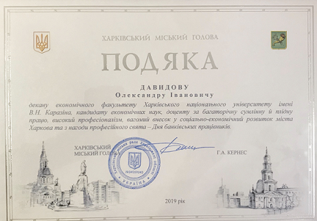 Вітаємо з відзнакою декана економічного факультету О.І. Давидова!20 травня 2019 року з нагоди Дня банківських працівників у Харківській міській раді привітали представників банківської сфери м. Харкова.