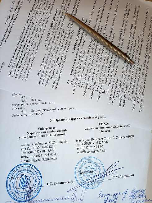 Підписано Договір про співробітництво зі Спілкою підприємців!1 вересня 2021 року було підписано Договір про співробітництво між Харківським національним університетом імені В.Н. Каразіна в особі ректора Кагановської Тетяни Євгенівни та Спілкою підприємців Харківської області в особі Президента Порошина Сергія Михайловича.