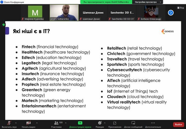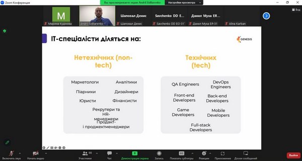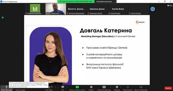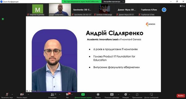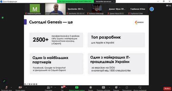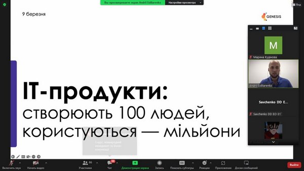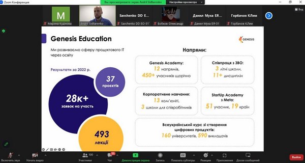 24 травня 2023 р. зустрічізі стейкхолдером - компанією Genesis24 травня 2023 р. студенти та викладачі кафедри маркетингу, менеджменту та підприємництва взяли участь у зустрічі зі стейкхолдером, компанією Genesis. Genesis – це українська кофаундингова ІТ-компанія, що будує глобальні технологічні бізнеси разом із найкращими підприємцями Центральної та Східної Європи. Визнані найкращим роботодавцем України воєнного часу за версією Forbes. Наразі студенти кафедри мають можливість пройти онлайн-стажування від Genesis «Створення та розвиток IT-продуктів». Величезна вдячність спікерам – Сідляренко Андрію, Academic Innovations Lead в IT-компанії Genesis, за змістовну розповідь про створення IT-продуктів та важливу роль в цьому не IT-фахівців, а також Довгаль Катерині, Marketing Manager (Education) в IT-компанії Genesis за відповіді на незліченні питання від студентів, за приклади з власного досвіду та мотивацію. Кафедра маркетингу, менеджменту та підприємництва пишається можливістю співпраці з однією з найкращих та потужних компаній України – Genesis. Це унікальний досвід, співробітництво з компанією Genesis в майбутньому буде лише посилюватися та розширюватися.