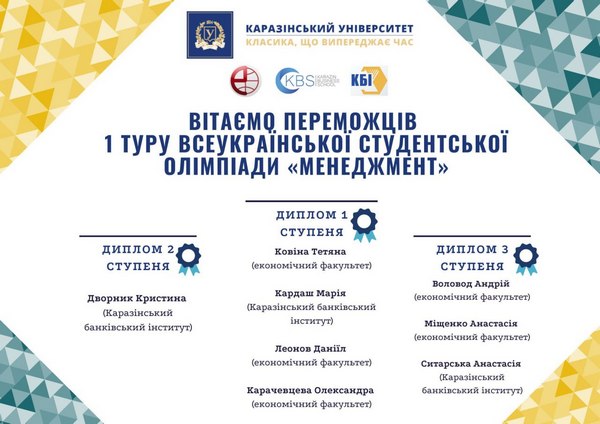 Вітаємо переможців: 1) Диплом 1 ступеня Ковіна Тетяна (освітня програма «Міжнародний менеджмент і бізнес-комунікації», кафедра маркетингу, менеджменту та підприємництва, економічний факультет) Кардаш Марія (освітня програма «Менеджмент організацій та адміністрування», кафедра менеджменту, бізнесу та професійних комунікацій, ННІ Каразінський банківський інститут) Леонов Даніїл (освітня програма «Менеджмент організацій», кафедра економіки та менеджменту, економічний факультет) Карачевцева Олександра (освітня програма «Менеджмент зовнішньоекономічної діяльності», кафедра маркетингу, менеджменту та підприємництва, економічний факультет) 2) Диплом 2 ступеня Дворник Кристина (освітня програма «Цифровий менеджмент в бізнесі», кафедра менеджменту, бізнесу та професійних комунікацій, ННІ Каразінський банківський інститут) 3) Диплом 3 ступеня Воловод Андрій (освітня програма «Фінанси, банківська справа та страхування», кафедра фінансів, банківської справи та страхування, економічний факультет) Міщенко Анастасія (освітня програма «Менеджмент зовнішньоекономічної діяльності», кафедра маркетингу, менеджменту та підприємництва, економічний факультет) Ситарська Анастасія (освітня програма «Менеджмент та глобальний бізнес», кафедра менеджменту, бізнесу та професійних комунікацій, ННІ Каразінський банківський інститут)